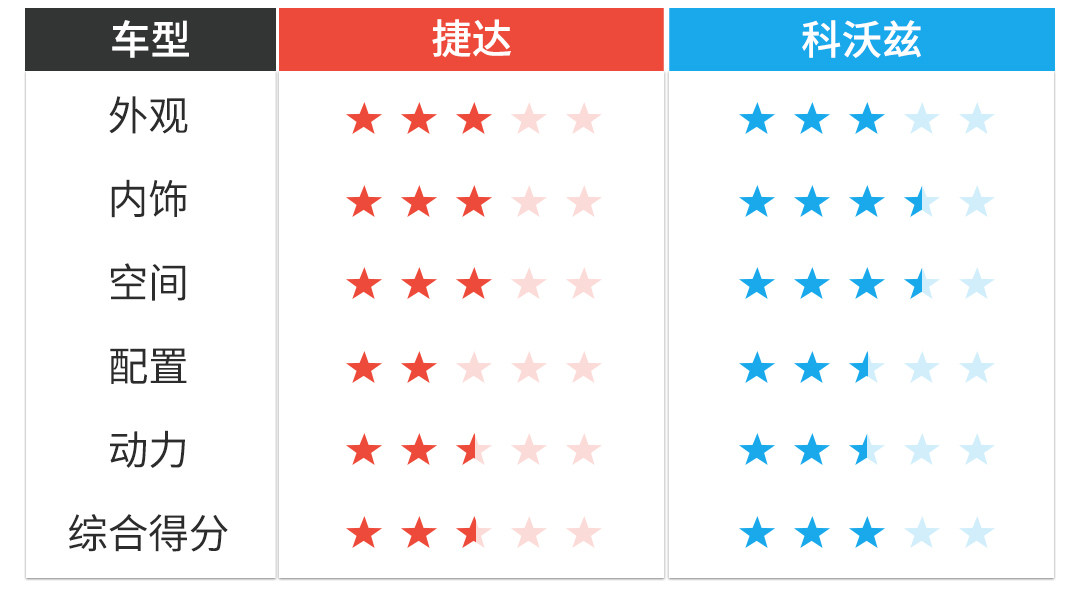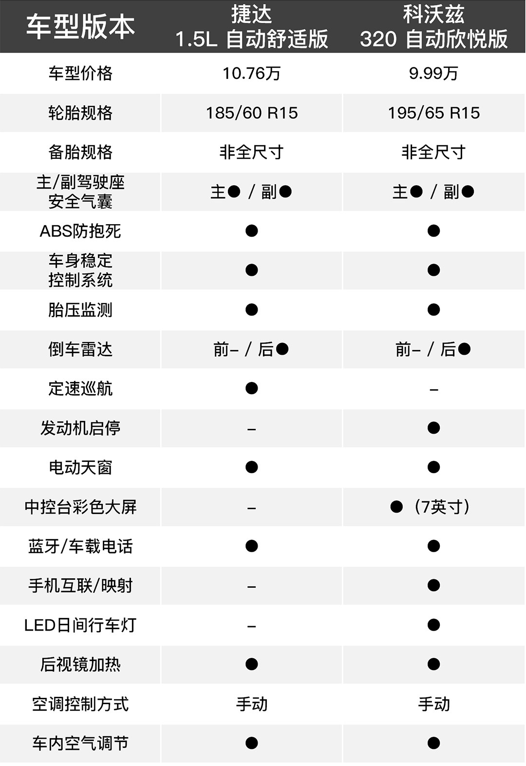 在配置水平方面,整体来说科沃兹还是略高于大众捷达的,但并没有过于突出的表现,基本都属于一些比较常规的实用性配置,而以上两个版本也是目前车型的注销版本,在配置方面也是基本满足到用车所需。