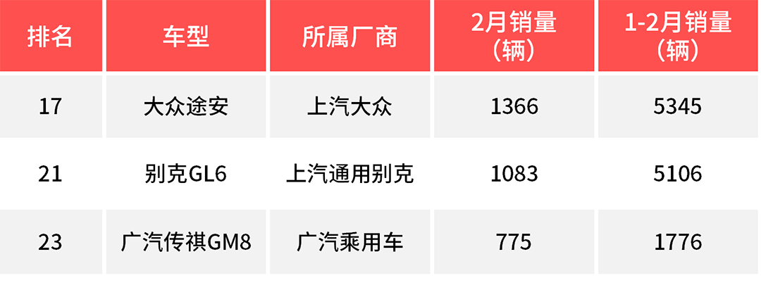 其中,我们可以看到大众途安、传祺GM8、别克GL6都有着不错的关注度。那销量呢?是不是也同样如意呢?