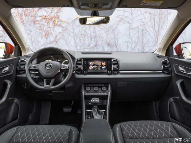 柯珞克的内饰同样延续了柯迪亚克的设计风格,中控台采用对称式设计,以黑色调为主体,搭配平直的线条和钢琴漆饰板的运用,风格中规中矩,也透着浓浓的大众味道。此外,高配车型的皮质座椅还采用了格子纹路的缝线装饰,搭配全景天窗,带来了不错的档次感。