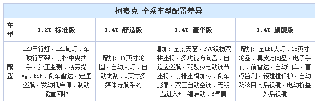 配置方面,柯珞克全系4款车型标配有LED日行灯、前排中央扶手、胎压监测、疲劳提醒、车身稳定系统、倒车雷达、定速巡航、自动启停等;1.4T舒适版在此基础上增加了17英寸轮圈、自动大灯、自动雨刷、9英寸多媒体导航系统;1.4T豪华版在舒适版基础上进一步增加了全景天窗、多功能方向盘、自适应巡航、主驾驶座椅电动调节、前排座椅加热、倒车影像、双区自动空调、无钥匙进入/一键启动、6气囊等;而顶配的1.4T旗舰版则独享了全LED大灯、18英寸轮圈、真皮方向盘、电子手刹、前驻车雷达、自动泊车辅助、盲点监测、自动防眩目内后视镜,以及外后视镜电折叠等。