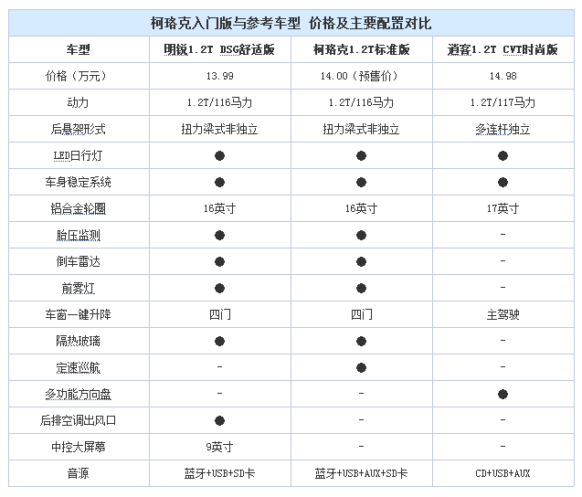 上文我们已经提到,柯珞克的入门车型就已经标配了诸多配置,包括LED日行灯、前排中央扶手、胎压监测、疲劳提醒、车身稳定系统、倒车雷达、定速巡航、自动启停等,配置丰富度整体超越了售价14.99万的逍客1.2T CVT时尚版(同为入门自动挡车型)不少,并且与同门的明锐1.2T DSG舒适版(售价13.99万)基本持平。在性价比如此高的情况下,我们预计柯珞克入门车型的实际售价不会比14万元的预售价低上太多,比如13.99万元就是个不错的猜测。