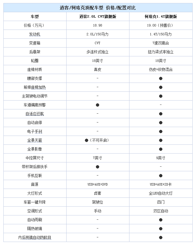 顶配车型价格的推测方法同理于上文的入门版车型。我们知道,柯珞克1.4T旗舰版对应的预售价格正是预售价区间的终点19万元,这与逍客顶配车型18.98万元的售价十分接近。现在,我们将柯珞克1.4T旗舰版与逍客2.0L CVT旗舰版的配置差异列出: