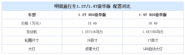 以明锐旅行车1.2T/1.4T DSG豪华版车型作为参考进行对比,二者除动力上分别搭载1.2T/1.4T发动机外,其余的主要差异仅包括1.4T车型换装了17英寸轮圈和LED自动大灯,而价格相应提升了1万元。