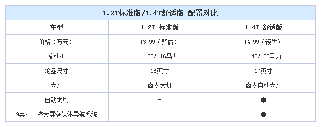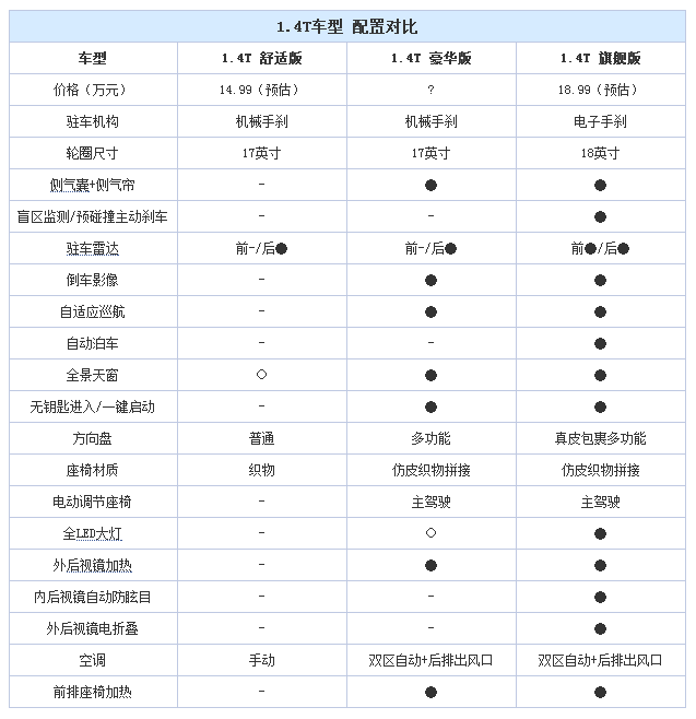 接下来需要推测的是1.4T豪华版车型的价格。由于动力总成与1.4T舒适版、1.4T旗舰版完全一致,因此这三款车型的区别就仅仅是配置上的差异了。通过上表我们不难看出,1.4T豪华版车型相比舒适版有着外观细节、舒适性、主被动安全等多方面的升级,全景天窗、侧气囊+侧气帘、倒车影像、自适应巡航、主驾驶电动调节、座椅加热、双区自动空调、全LED大灯、后排空调出风口等实用装备均成为了1.4T豪华版的标配。