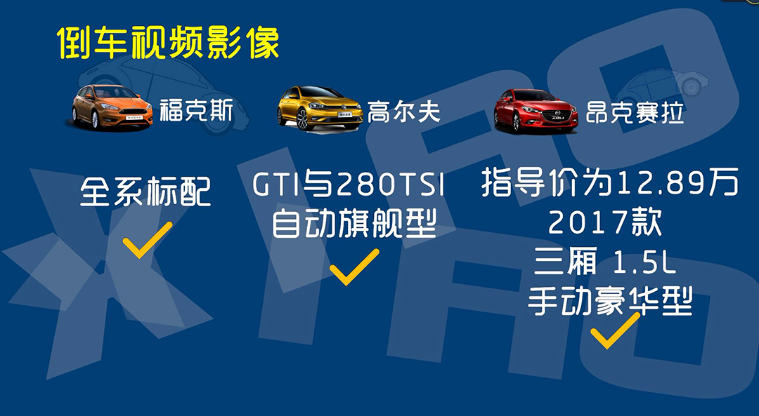 3、再来看看倒车视频影像,福克斯又给我了惊喜,做到了全系标配,昂克赛拉要在指导价为12.89万的2017款 三厢 1.5L 手动豪华型才开始配备,而2018款的高尔夫只有GTI与280TSI 自动旗舰型上才带有。