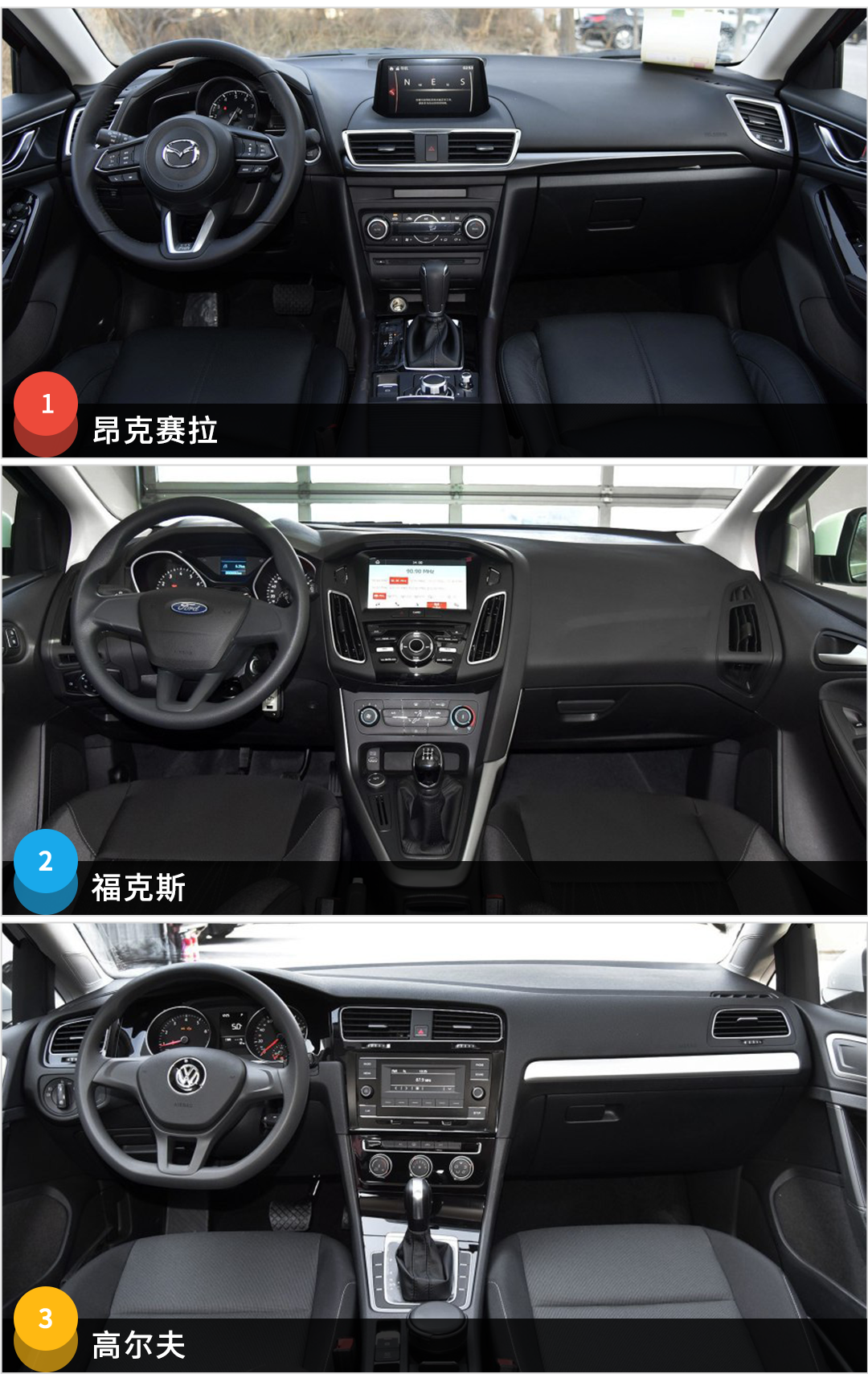 高尔夫的内饰设计是三车中最有质感的,虽然看起来并没什么新鲜味道,但它摸起来软、做工细致,而且中控面板的设计整体偏向驾驶席一侧,方便驾驶员在行车时进行操作。