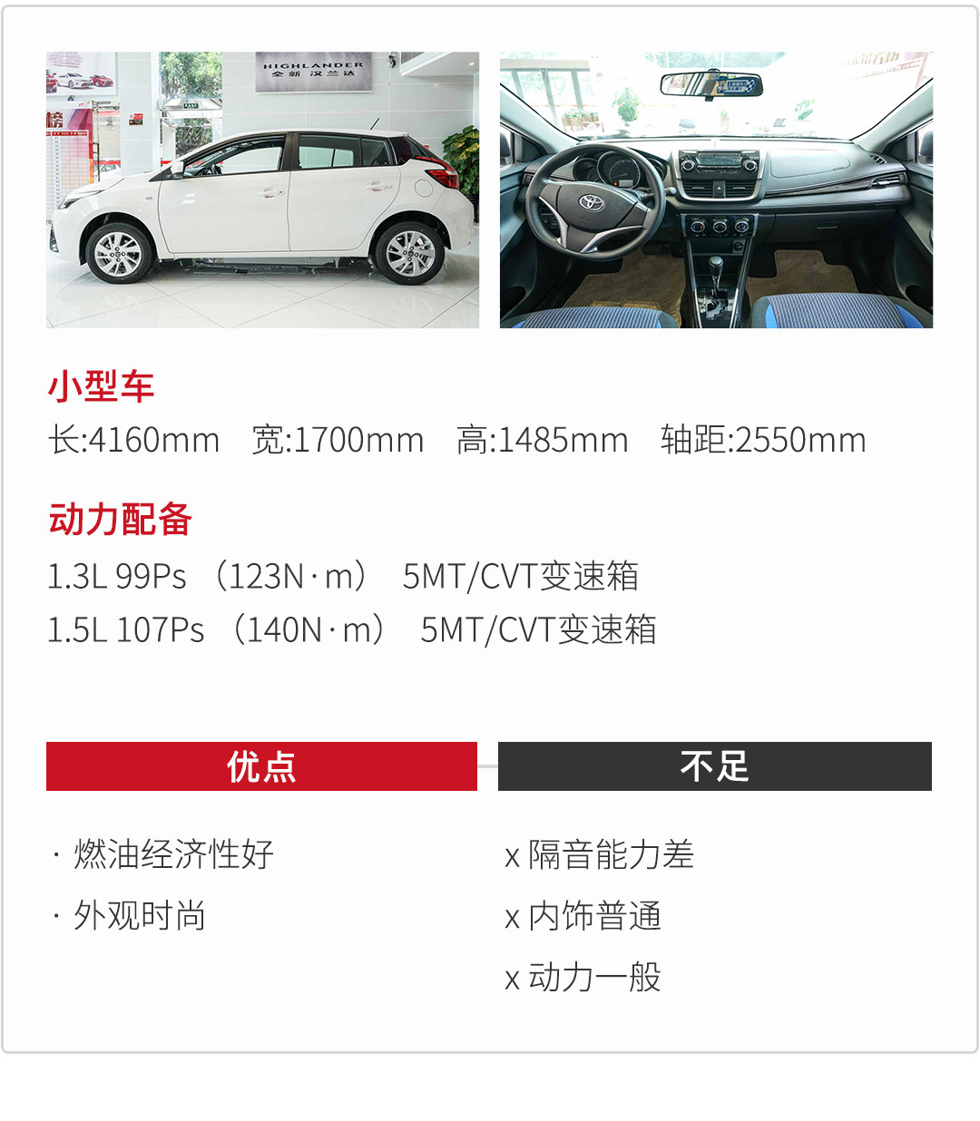 在小型车的市场上,颜值实属重要,本来就没豪华氛围,外观还不搞好,就很容易当成老年代步车。YARiS L 致炫前脸性感的小胡子 ,和个性的颜色选择深受年轻人的喜爱。车身长4160mm 宽1700mm 高1485mm 轴距达到2550mm,在同级别内也很有优势,配置方面ESP、制动力分配都是标配的。动力方面有1.3L自然吸气发动机 能输出99Ps,最大扭矩123N·m,1.5L自然吸气发动机能输出107Ps,最大扭矩140N·m,搭配5MT/CVT变速箱,动力在城市中只是刚好够用。