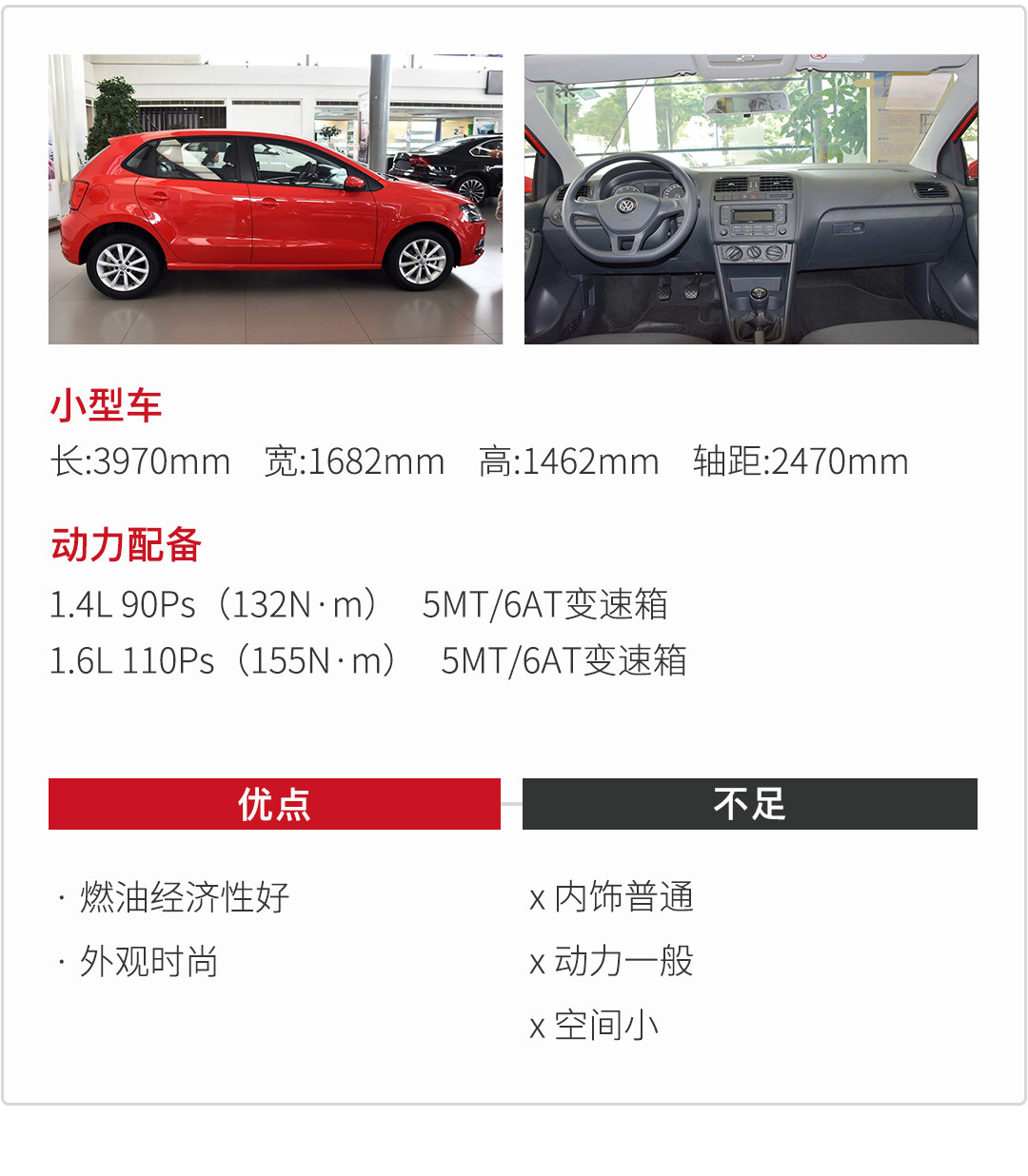 电视剧《欢乐颂》里面富二代曲筱绡开的就是大众Polo,排除电视做秀成分,那就证明Polo很适合年轻人时尚的风格,还有Polo的稳定性与实用性也得到众人的认可。大众Polo长3970mm 宽1682mm 高1462mm 轴距2470mm,车身侧面线条简明扼要,一道笔直的高腰线从头灯贯穿车身直达车尾,依旧是走简约的路线。动力方面有1.4L自然吸气发动机,能输出90Ps 最大扭矩132N·m,搭配5MT/6AT变速箱,和1.6L自然吸气发动机 能输出110Ps,最大扭矩155N·m,搭配5MT/6AT手自一体变速箱,在城市里通勤基本够用。