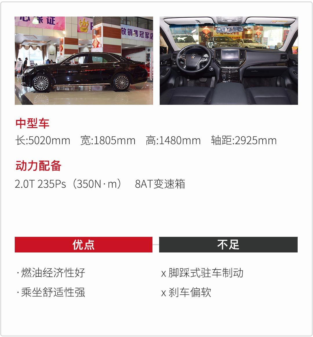 皇冠是丰田旗下老牌豪华品牌,看着雍容华贵的皇冠Logo,老板气质油然而生,车头,方向盘,C柱上都是皇冠的Logo,无时无刻都在告诉你它身份尊贵。皇冠车长5020mm 宽1805mm 高1480mm 轴距2925mm,皇冠只有2.0T涡轮增压发动机搭配8AT变速箱的动力总成,动力十足,虽说搭载涡轮增压发动机,但是调校出来还是很线性平顺,依旧保留了皇冠应有的气质。