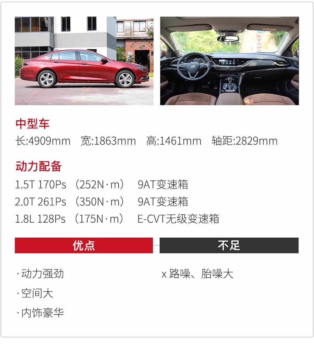 君威是一款浓厚运动气息的中型轿车,搭载1.5T和2.0T的涡轮增压发动机,搭配横置的9挡手自一体变速箱。动力参数分别是170Ps 252N·m和261Ps 350N`m。这样的动力参数在同级别车型中属于很强劲的等级。这款变速箱在S挡下,降挡速度非常快,具备“kick down”的功能,唯一不足就是除君威GS外,强大动力总成却没有换挡拨片,缺少一点可玩性。君威内饰颜色搭配特别,用料材质柔软,整体具备豪华感,配备HUD抬头显示器的车辆行驶信息丰富,电动天窗,保证实用性。