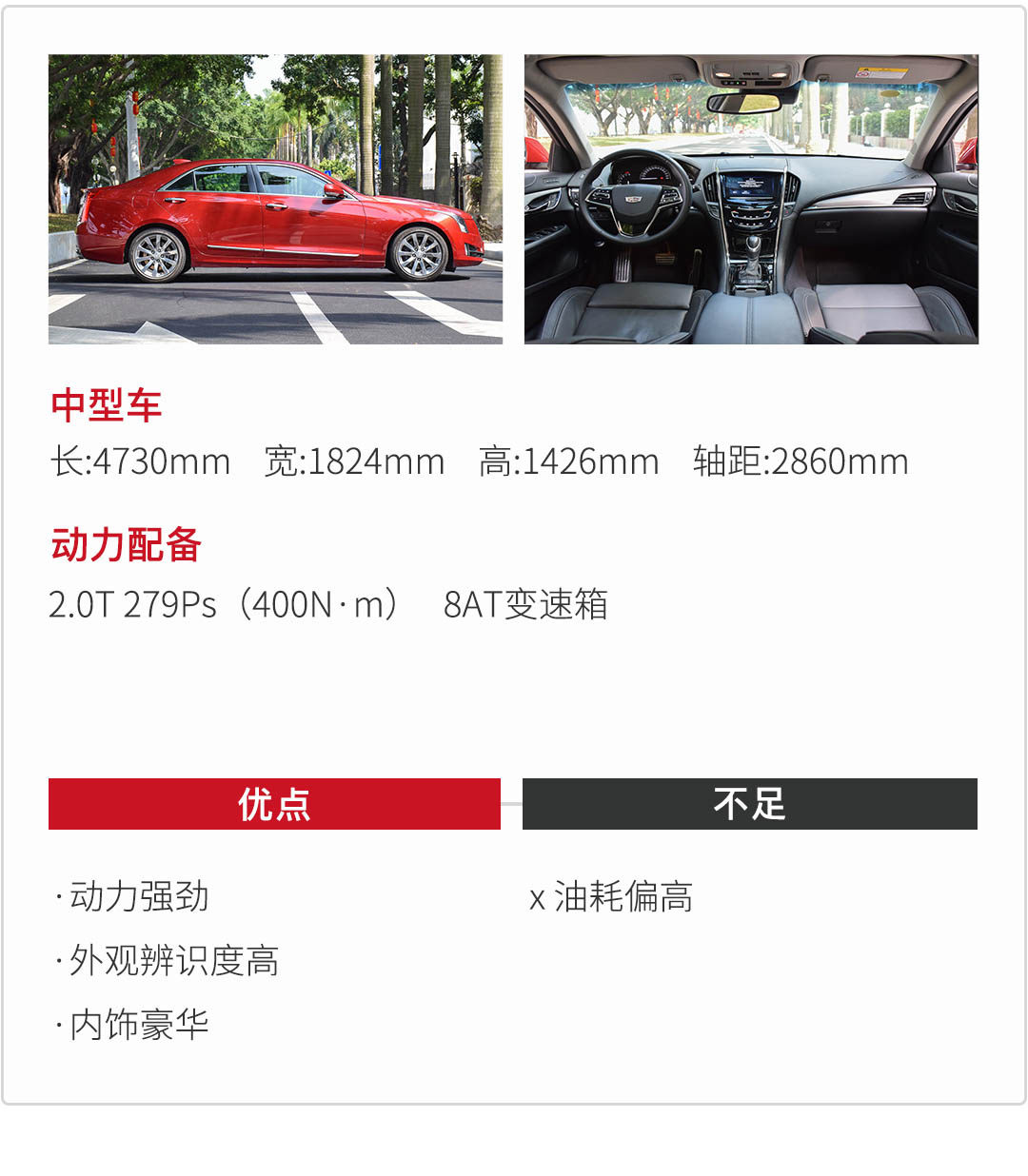 凯迪拉克ATS-L对比马自达阿特兹和别克君威有着更强大的产品力,其背后的豪华毋庸置疑。在运动中型轿车的阵型中少不了凯迪拉克ATS-L的身影。品牌独有的钻石切割设计,辨识度很高,车身刚硬的线条,和发动机盖上的隆起,告诉你我有一颗躁动的心。其搭载了2.0T涡轮增压发动机,与之匹配的是8挡手自一体变速箱。动力参数高达279Ps 400N·m,动力相当惊人,车身紧致,底盘扎实,偏重的方向盘容易勾起一个人的驾驶欲望。