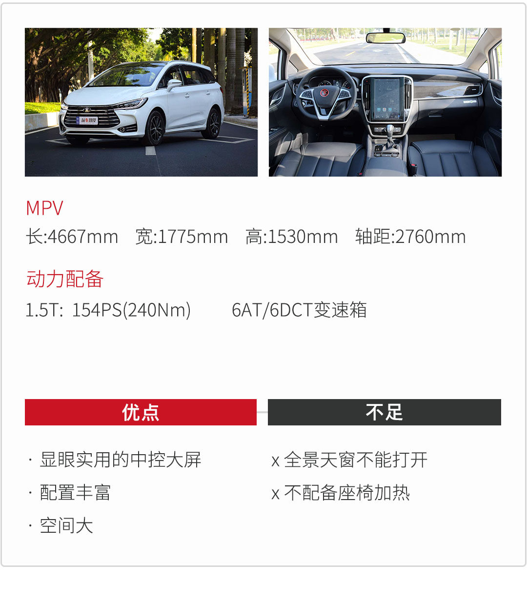 当然,宋MAX的驾驶感受也是非常出色的,配备了6挡双离合变速箱的它在行驶中换挡感觉是微乎其微的,作为家用车,最理想的就是这样一个换挡平顺的感觉。而且,这款车目前全系标配无钥匙进入和无钥匙启动,这真可谓是够有面子的配置了。所以,推荐这款车,相信您在购买MPV的时候也会考虑的!这款车的天窗不能打开,这不得不说是一个不小的遗憾,而且还有座椅加热也没有配备。