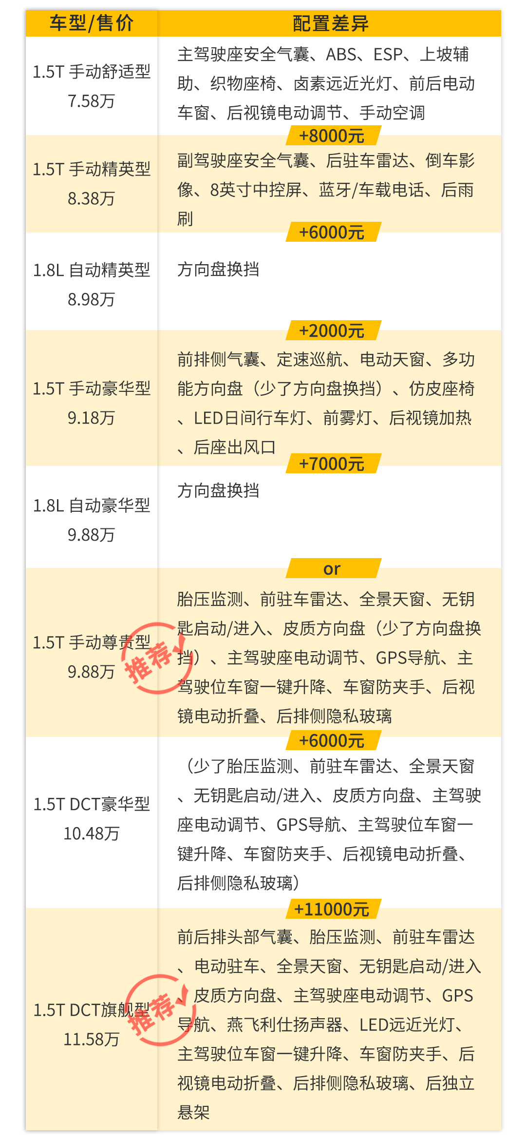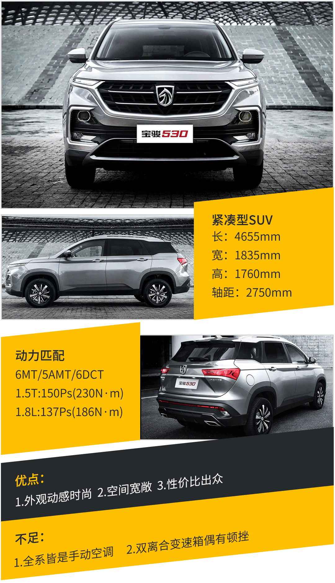 通过配置表不难看出宝骏530主打的是1.5T的手动挡车型,其中1.5T手动尊贵型的配置已经与1.5T DCT旗舰型的配置相差无几,常用实用的配置都一应俱全。虽说1.5T DCT 车型更适应时代步伐,但要丰富的配置却要上顶配,这比1.5T手动尊贵型要多出近2万元,性价比并不算高。因此,配置丰富的1.5T手动尊贵型显然更值得推荐,前提是你得适应手波。