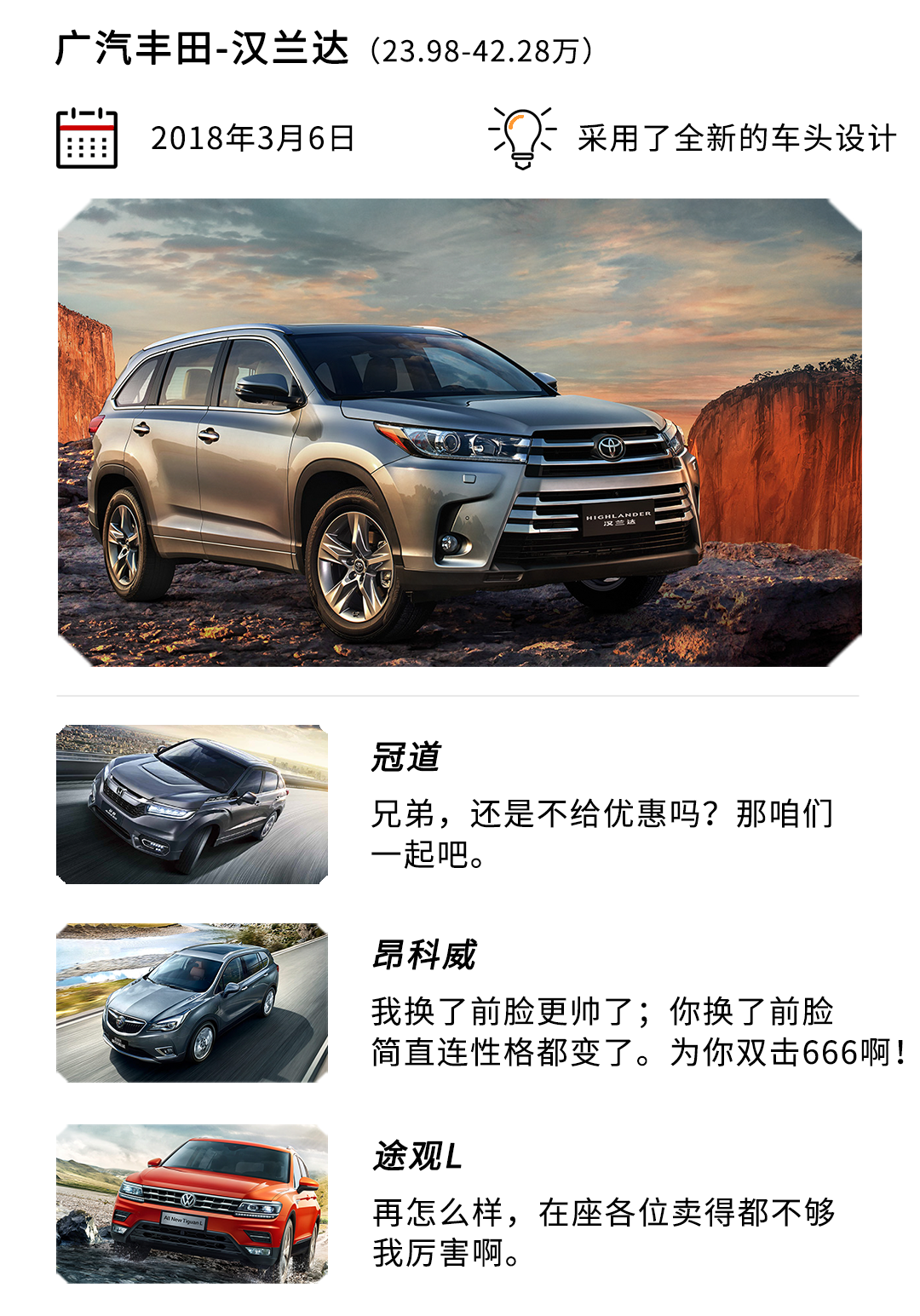 汉兰达:怎么样?不认得我呢?问我前段时间是不是去了韩国?我不就是前脸变化比较大而已,是不是更霸气、更威猛了呢?别说我配置不够多,这次改款,我可是有备而来的,增加了不少的配置,再加上我原本就有着宽敞的空间、成熟可靠的三大件,是不是对我心动了呢?