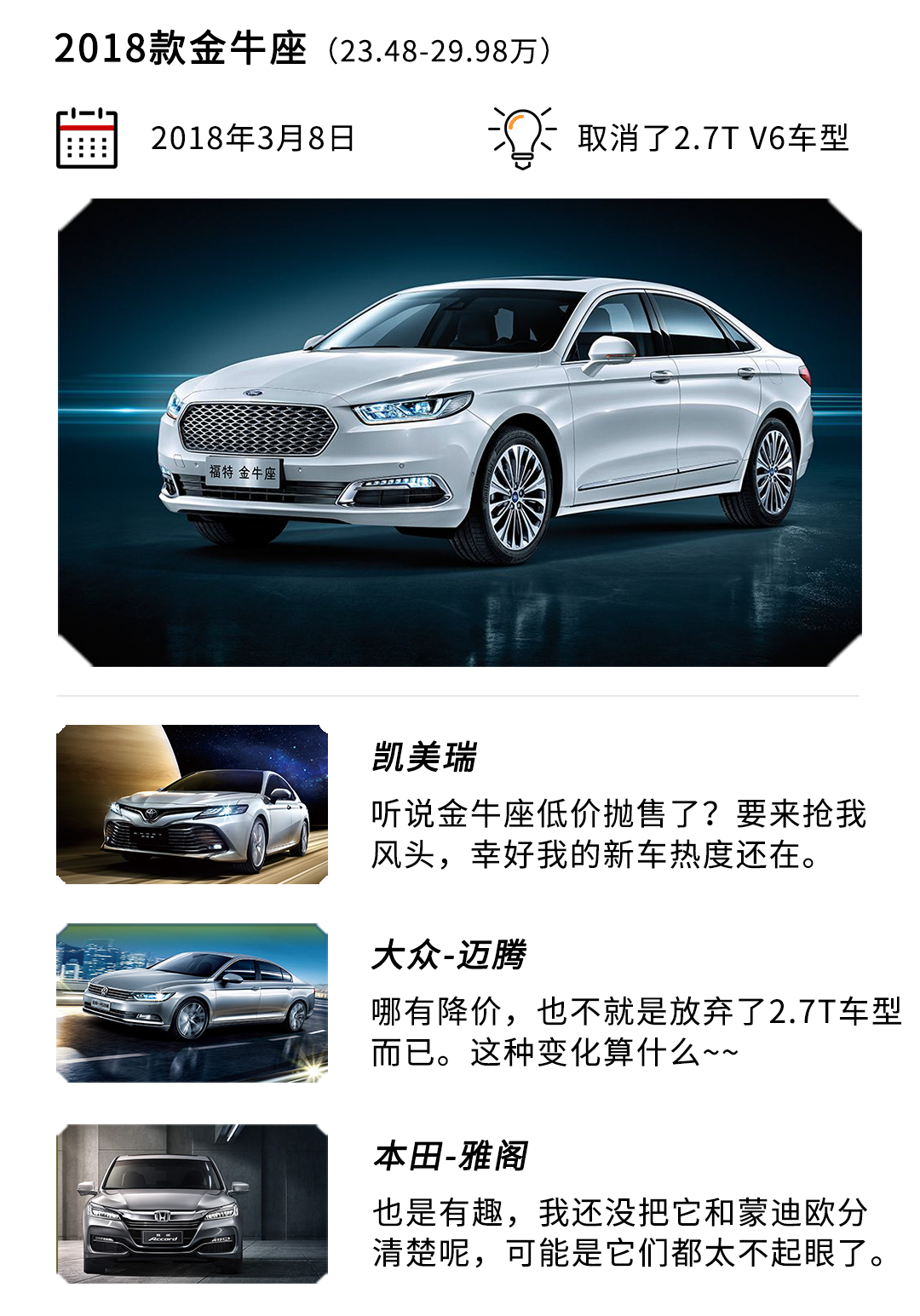 2018款金牛座:抛弃了2.7T车型,其实我也很心疼啊。但现在都流行小排量车型,将2.7T车型淘汰也是迟早的事了。
