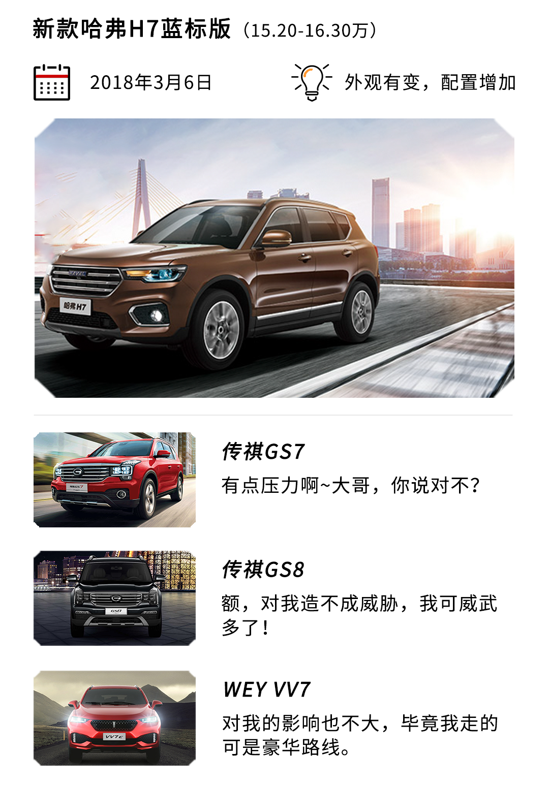 哈弗H7:销量一直不温不火的,我也很难过啊!只能改款,刺激一下消费者了。别看2018款哈弗H7蓝标版目前只有两车型,它们可都标配了全景影像、9英寸中控彩屏、全景天窗、皮质座椅哦!除此之外,新车还加入ACC自适应巡航、主动刹车、疲劳驾驶检测等高科技配置,还是很有诚意的。