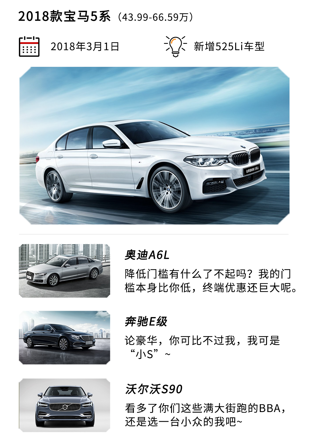 2018款宝马5系:大家想买宝马5系?差几万块?没关系,我已经增加了525Li车型,降低了门槛。现在43.99万起就能将我带回家了,是不是很开心?
