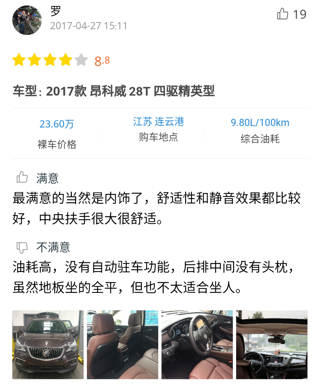 看来车主们对于昂科威的内饰豪华感、静谧性、乘坐舒适感是相当满意的,当然车无完车部分车主在油耗方面持保留意见。