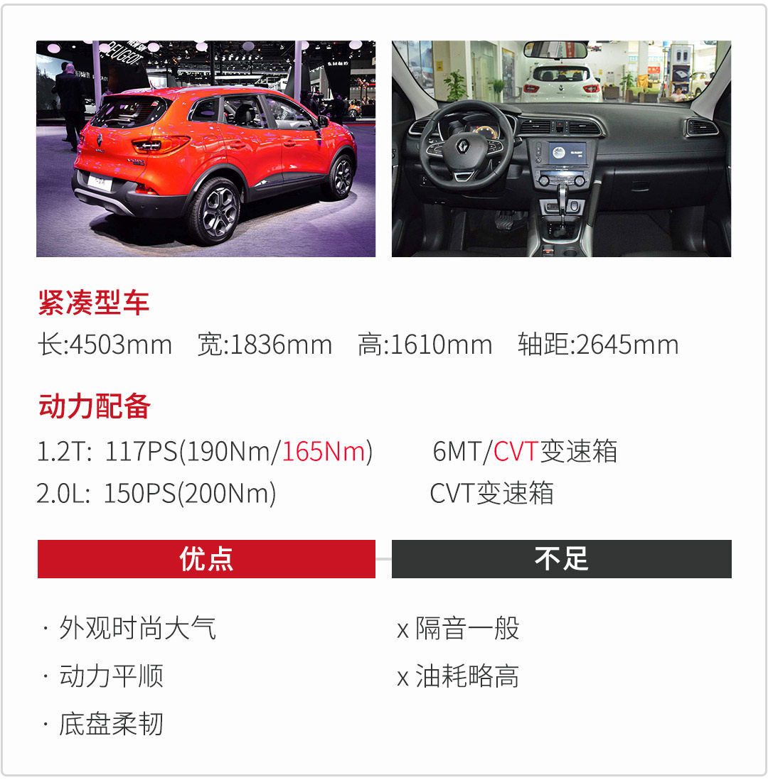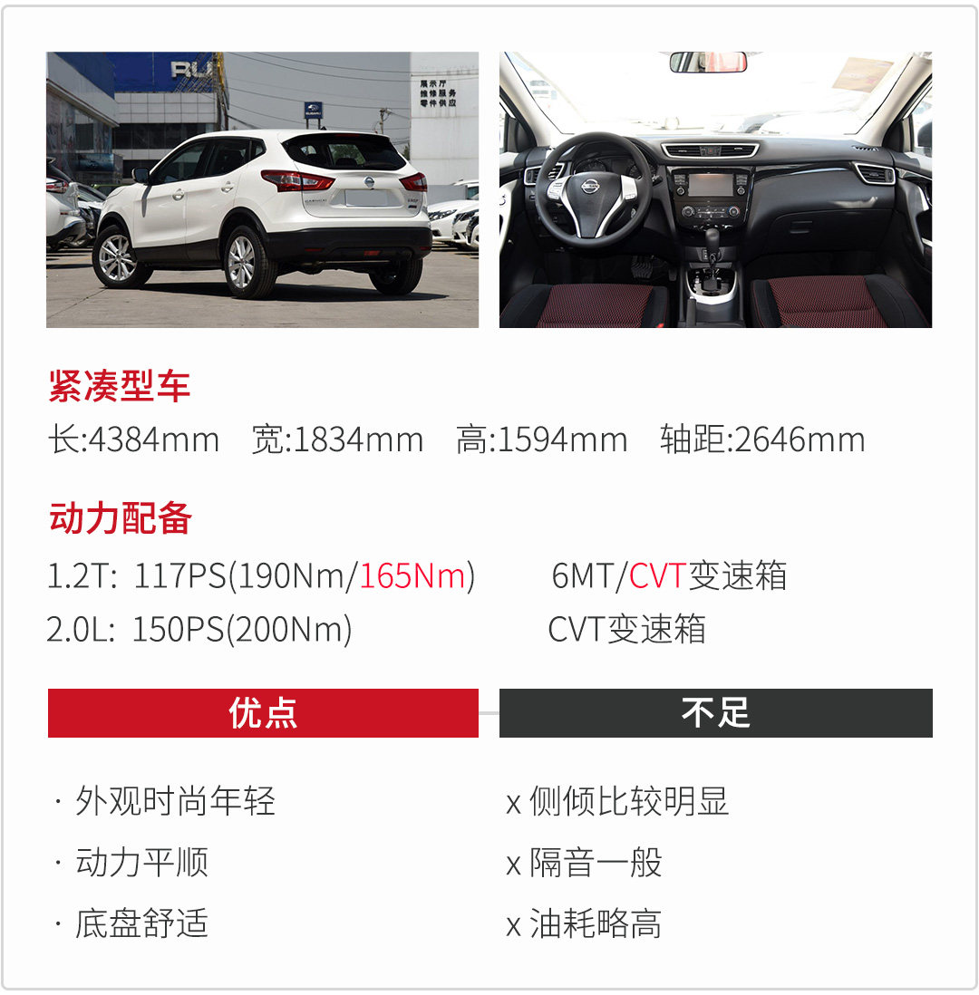 挑了逍客这么多毛病,该聊聊优势了。成熟的动力和底盘调教,让逍客质量一直保持得很好。加上日产大量的4S店分布,逍客后期维修保养的便利性和价格方面是有绝对优势的。再加上逍客有1万多的优惠,所以最终裸车价在12-17万之间,性价比不错。逍客在A-级SUV领域是一个绝对不会出错的选择。