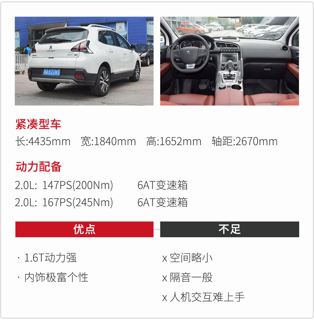3008最尴尬的地方就是动力。2.0L版本动力非常一般,油耗高且动力弱。1.6T虽然省油动力足,不过售价太高,即使优惠后,裸车价也要将近15万。这个价位可以买到尺寸更大的C5 Aircross了。而且法国人自成一家的人机操作让一般人难以上手,再加上乘坐空间较小,所以目前销量一跌再跌也不奇怪了。