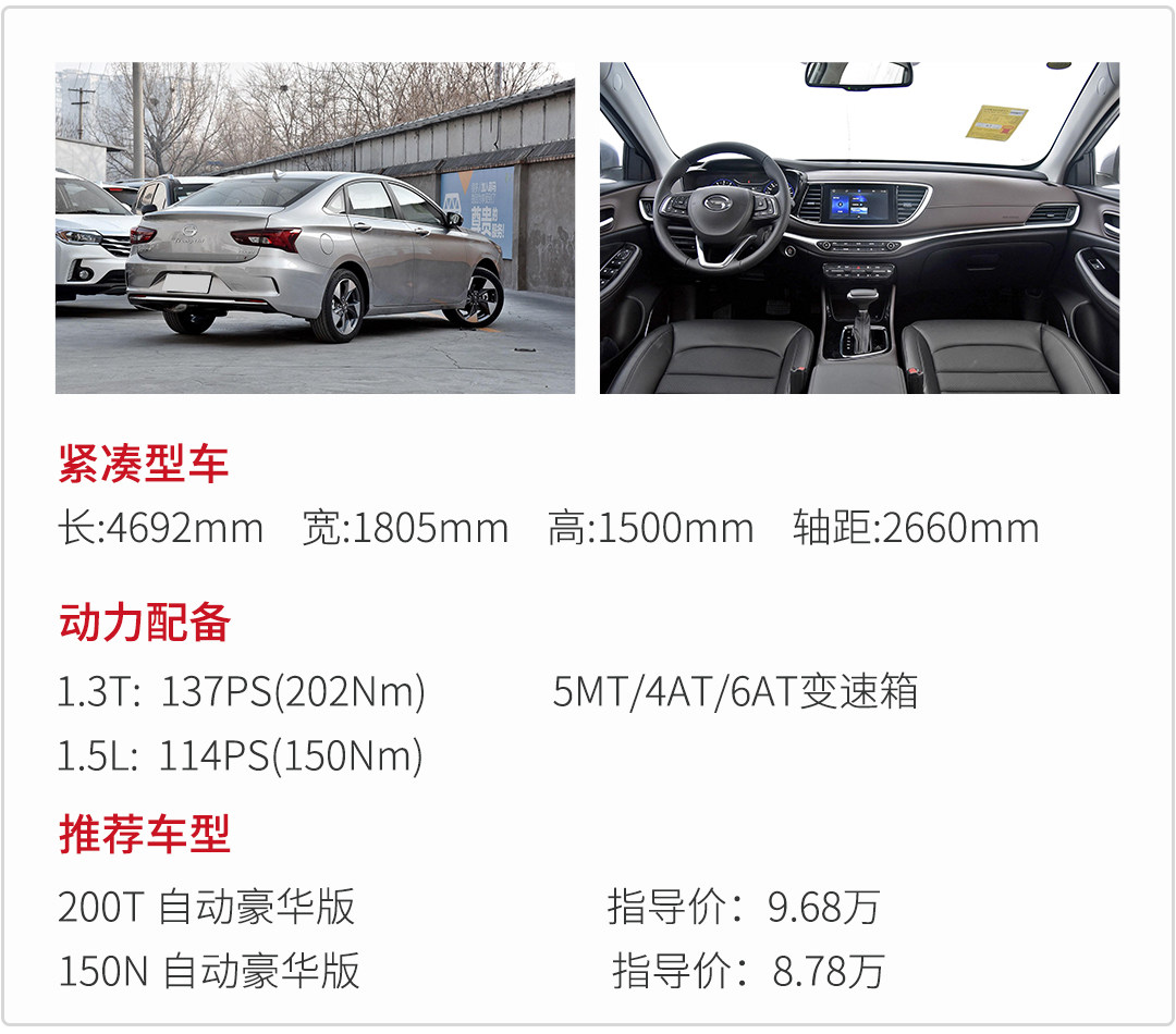 在动力上GA4有1.5L和1.3T发动机供消费者选择,其中1.3T发动机初段油门调校比较灵敏,在市区驾驶时给人动力较充沛的感受,这点跟日系车比较相似,平时家用还是没问题的。同时匹配来自爱信的6AT变速器换挡平顺,逻辑清晰,在驾驶层面能让人满意。悬架方面GA4采用前麦弗逊后扭力梁式悬架,整体表现一般,面对路面颠簸时显得不够紧实,车身会有多余的跳动。