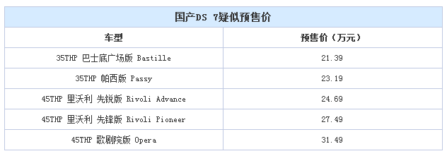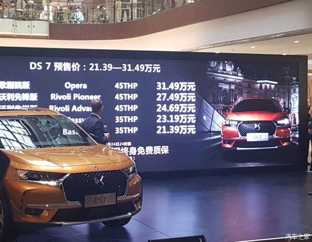 日前,DS官方公布了国产DS 7 5款车型的预售价,此次开启预售的车型共有5款,其预售价区间为21.39-31.49万元。DS 7是国产DS车系中的旗舰车型,它将于今年北京车展正式上市。官方表示,预售期间订车成交后可享受终身质保。