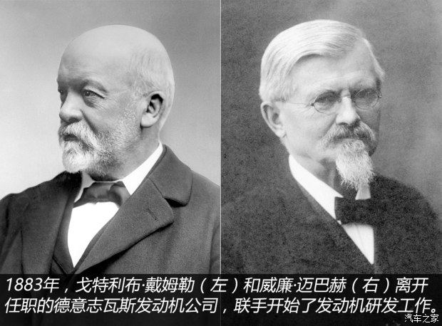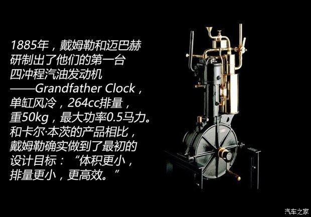 在卡尔·本茨忙着制造奔驰一号的时候,戴姆勒和迈巴赫也没闲着。1882年,戈特利布·戴姆勒和威廉·迈巴赫相继从原来工作的德意志瓦斯发动机公司离职,并于第二年开始自己建立工厂,研制汽车发动机。1885年4月,他们的第一台四冲程发汽油发动机获得了专利。这台发动机名叫Grandfather Clock,单缸风冷,264cc排量,重50千克,600转/分钟时可达到0.5马力的最大功率。