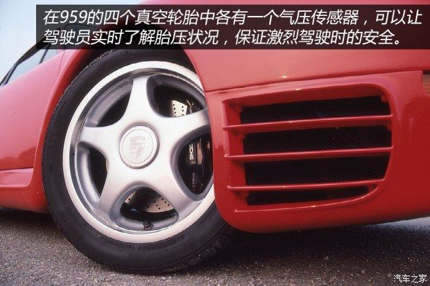 可以说保时捷959是一台怪车,一台影响了保时捷历史的车。除了四轮独立悬架、双涡轮增压、在车上还有一个配置,是汽车史上的新发明——胎压监测。为了保证959在高速行驶以及赛事中的安全,保时捷工程师在959的四个轮胎内部都安装了一个气压传感器,当轮胎压力不足时仪表台上便会出现提示。至于是数显还是单纯的报警灯就不得而知了,我猜应该是后者。