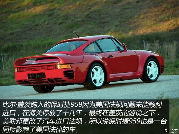 关于959还有一个有意思的故事,是说在保时捷959发售时,微软创始人比尔·盖茨也购入了一台,但当时这款车没有针对美国市场投放,美国的交通部和环保署也没有对这台车进行认证,因此无法入关,于是盖茨的这台959在旧金山港的海关里一放就是十多年。然而十几年间盖茨并没有放弃他的车,始终通过各种渠道去游说政府修正相关法律法规。终于在1999年,美国联邦政府更改了法规,允许少部分以研究、展示、赛事等目的进口的汽车可以不受联邦机动车安全标准的约束。所以说保时捷959也是一台改变了美国法律的车。
