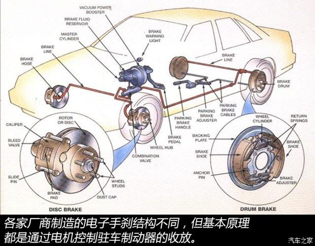 电子手刹与传统机械式手刹的工作原理大致相同,都是通过对后轮施加制动力,通过驻车刹车片与刹车盘(鼓)之间的摩擦力让汽车保持静止,防止滑动。各家厂商生产的电子手刹结构不同,但大方向都是用按钮控制电机收放驻车制动器,从而替代了人力拉动手刹拉杆,通过拉线控制制动片的形式。