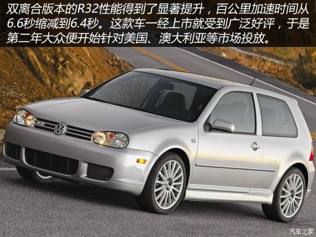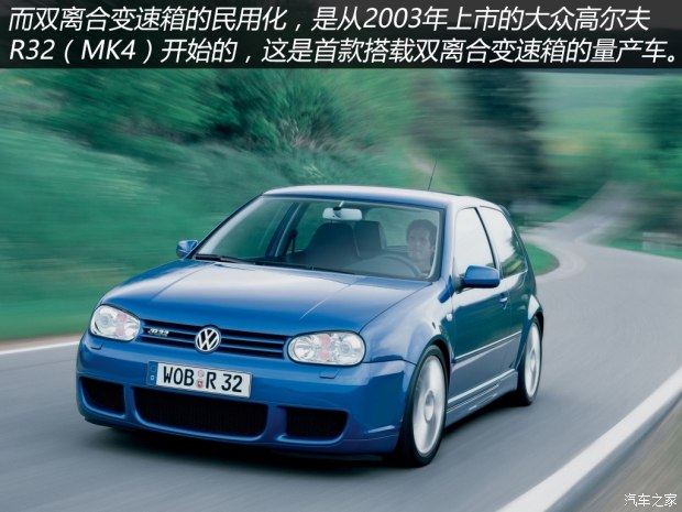 双离合变速箱真正走入普通消费者视线,还得说是2002年问世的2003款大众高尔夫R32(MK4)。起初这款车只在德国市场销售,但一经上市便受到了消费者意想不到的欢迎,于是从2004款就开始投放美国、澳大利亚等市场。在这台DSG双离合变速箱的加持下,R32的百公里加速时间从6.6秒缩减到6.4秒,1/4英里尾速也提升到了159.6公里/小时。
