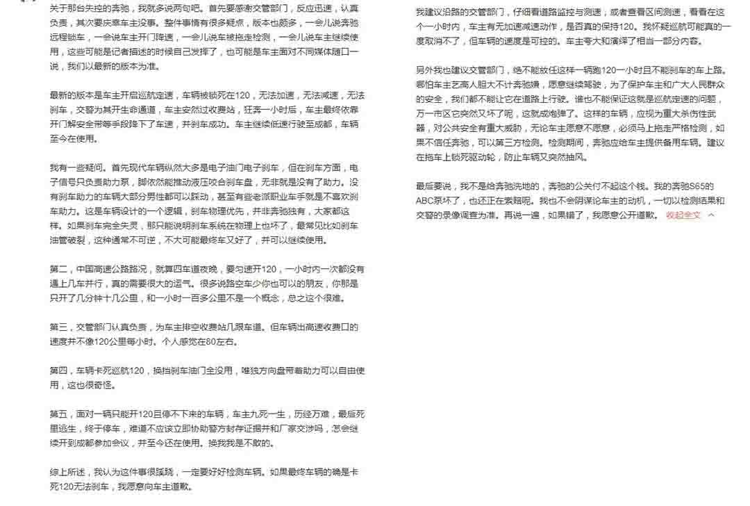 这几天网络上大部分车圈的热闻都是关于奔驰车主在高速上120km/h狂奔一个小时事件。从河南到陕西的连霍高速上,据车主薛先生所说,其驾驶的奔驰C200L轿车在设定定速巡航120km/h,连续巡航约一个小时以后,发现无论什么操作,都无法解除定速巡航,上演了中国版的生死时速,最终在警方、奔驰厂家和车主已打开车门准备跳车时发现车辆降速的情况下,车辆的刹车“恢复”正常。