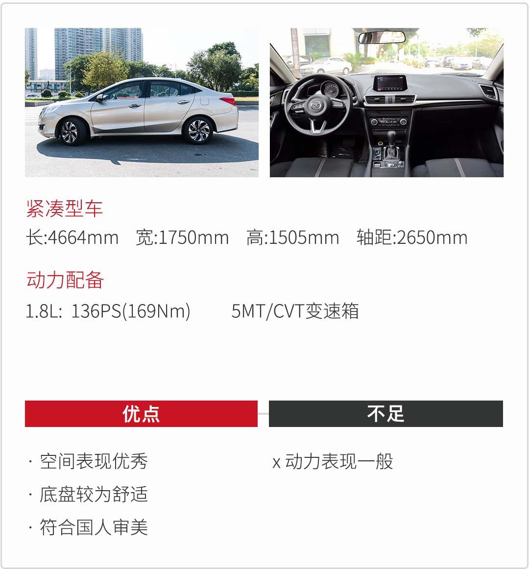 内饰方面,昂克赛拉也是把运动气息表现得极致,如炮筒状设计的仪表盘,创驰蓝天技术以及偏向于驾驶员的手刹等等。但有得必有失,在如此浓厚的运动气息里,它的空间表现却不够理想,这也是追求运动个性所要舍弃的一方面吧。