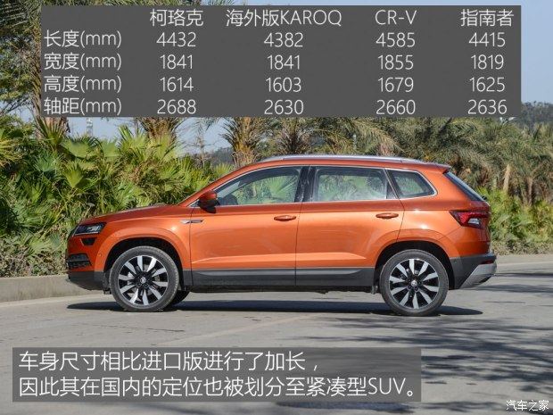 柯珞克定位紧凑型SUV,外观方面则是延续了斯柯达SUV的家族式设计,整体造型跟柯迪亚克比较相似,车身尺寸方面则跟同级别的CR-V和指南者等车型比较接近,见过柯迪亚克的朋友会对柯珞克的造型感到比较熟悉。
