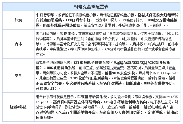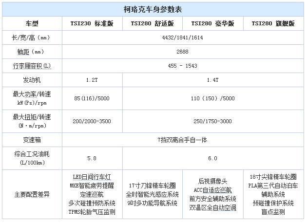 柯珞克目前只有2个排量共4款车型,数量不多,而且每个型号之间的差价比较大,配置的档次区分也很明显,应该说消费者要选择的话不会很难。下面我们我们详细列举各型号间的配置差异,帮助大家更好的选车。