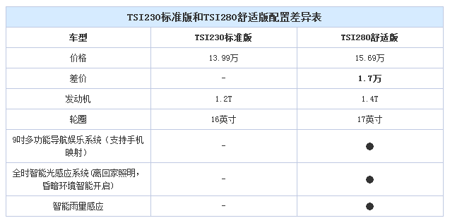 TSI280舒适版换上了1.4T发动机,动力方面不需要担心,配置上舒适版和标准版的差异并不大,看得见的地方是升级了17寸轮圈,内饰方面增加了9寸多功能娱乐系统,整体的配置要更加均衡,没有明显短板。当然价格也比标准型拉开了1.7万元的差距,总价15.69万元的价格应该说已经不算低了,基本是同级别主流水平。