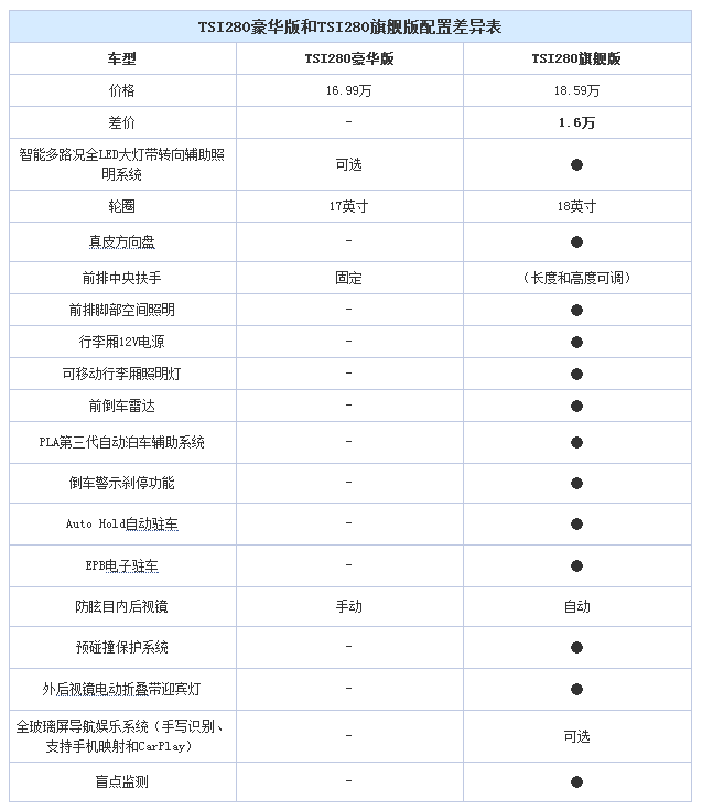 豪华版相比舒适版增加了比较多的配置,在安全、舒适性和便利性方面都有提升,价格增加是1.3万元。其中比较实用的配置包括全景天窗、皮革座椅和免钥匙进入及一键启动等,安全性的提升包括了ACC自适应巡航、前方安全辅助系统、后视摄像头等,应该说1.3万元的差价还是物有所值的,总价控制在17万以内,性价比较高。