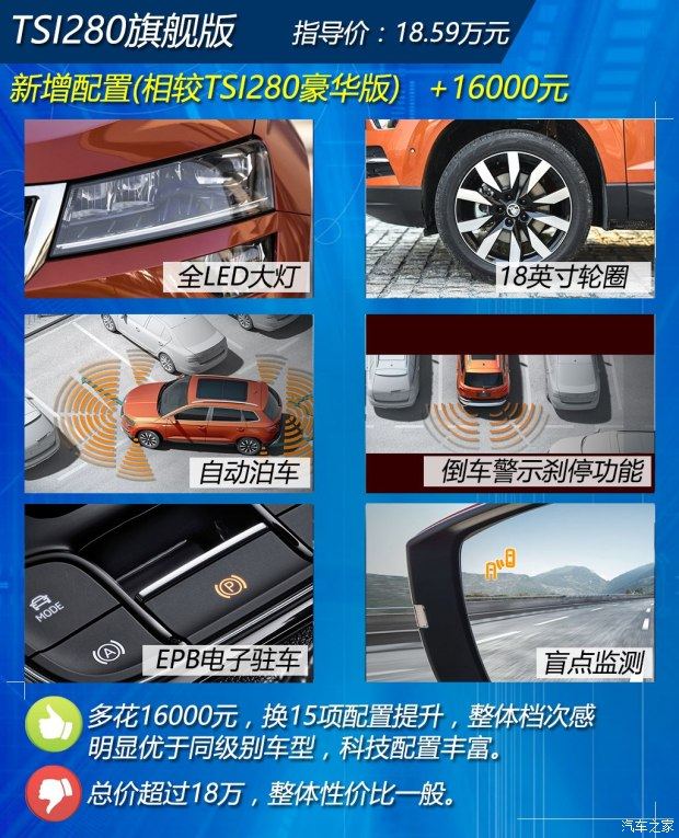 旗舰版比豪华版升级了15项配置,价格也增加了1.6万,其中多数是比较高端的设备,比如LED大灯、自动泊车、电子手刹、倒车警示刹停功能和盲点监测等,在安全方面提升明显,但这些都属于是锦上添花的配置,不是日常用车的必须功能,没有也不会影响日常使用。1.6万元的差价还是比较大的,总价超过了18万,已经向高一级别的柯迪亚克靠近,在同价位区间会面临高一级别的车型竞争,应该说整体的性价比不是很高,适合预算充足的朋友。