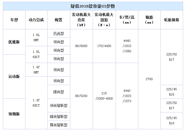 日前,我们从相关渠道获得了疑似2018款吉利帝豪GS的配置信息,新车将换装一台全新的1.4T发动机来取代现款车型上的1.3T发动机,全部配置车型也优化至十款。据悉,该车计划于4月中旬正式上市。