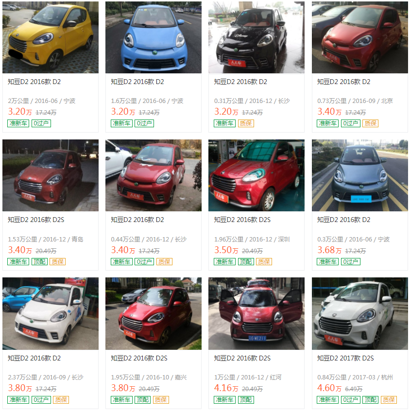 再退一步说,即使是10万不到买个小两厢电动车,像知豆D2或者奔奔这样的小车,作为年轻人代步车也是可以的,可是你可曾想过保值率?拿知豆D2为例,新车指导价15.18万—18.88万,补贴后价格在6万左右。根据二手车之家的报价,2017款的价格在4万上下这么一个价格,一年贬值近三成,而2016款的车型就已经跌到3万左右了,一半价钱就这样没了,一年跌一万,再多开两年,车商都不想收了。
