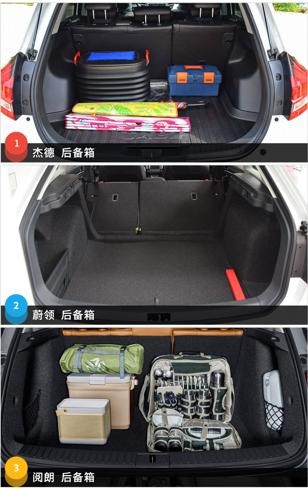 杰德的后备箱空间巨大,最大宽度1340mm,最小宽度1000mm,高度780mm,纵深920mm,并且第二排座椅可以放倒,让纵深达到1890mm。旅行车的后备箱是一个很重要的指标,蔚领的后备箱尺寸为,常规进深1000mm,宽1010mm,高810mm,将第二排座椅放倒后,最大进深1820mm。对于家庭来说,大尺寸的后备箱非常实用,谁用谁知道。阅朗的后备箱尺寸可能是这次对比最小的,常规进深870mm,宽990mm,高755mm,放倒第二排座椅以后最大进深1805mm。