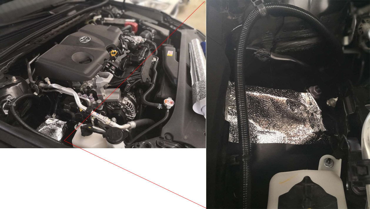 其实论坛上已经有机智的网友解决了问题,把发动机舱内和轮拱处洗干净,用泡沫胶或者其他东西把缝隙填上,再拿 防火锡纸 或者 隔热铝板 贴上,就解决了。