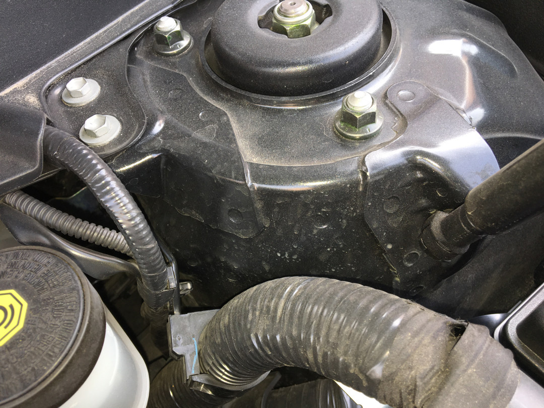 从悬挂这边观察一下,其实不用伸手进去,从悬挂这边的角度就可以看到发动机舱内部的一部分,但是机舱内并没有看到什么溅射的泥浆。