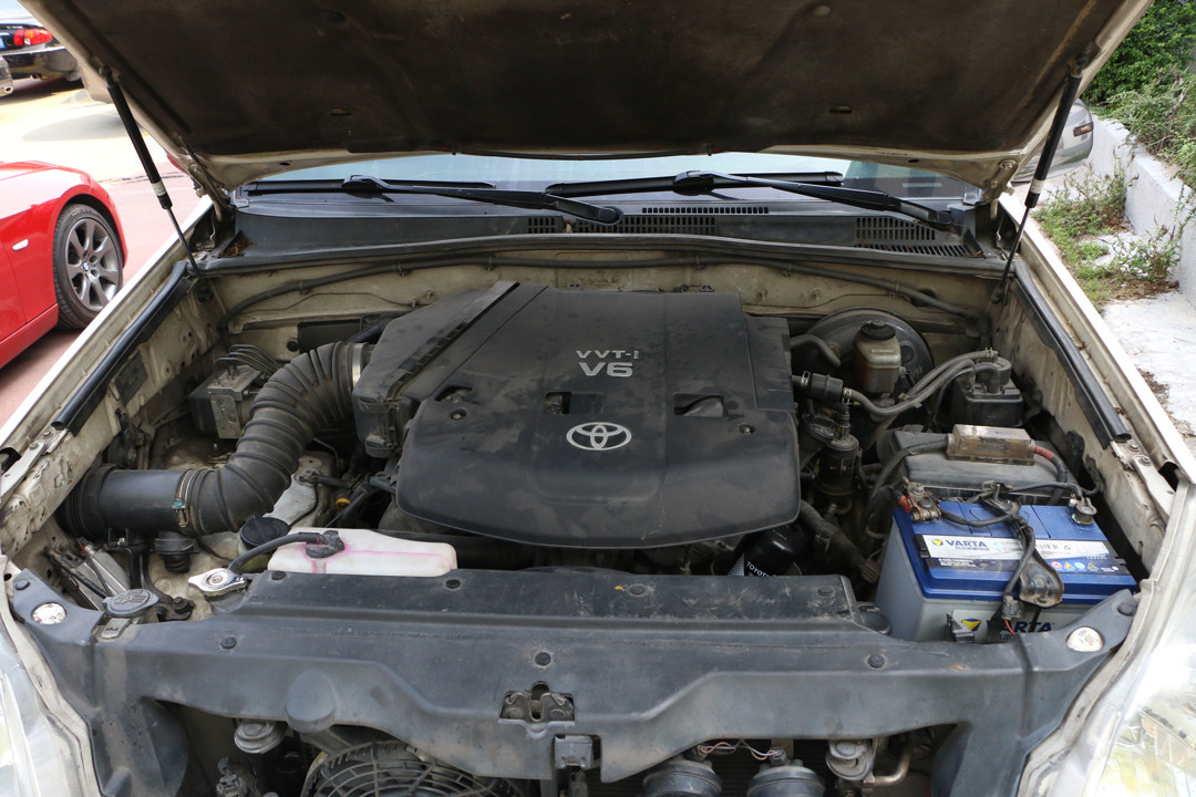 接下来看看没有那么干净的,丰田 普拉多,是2006年的那款了,看发动机舱,舱内到处都是积尘、泥渍,发动机盖上也有,就不像是泥浆门了,可以说是泥石流门了~(皮了一下)