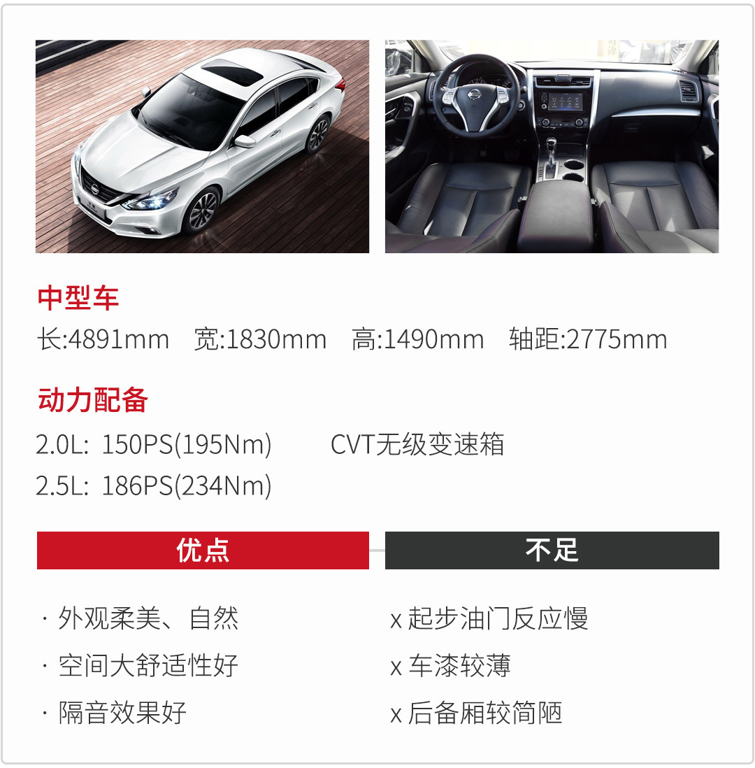 天籁采用了2.0L和2.5L两款自然吸气发动机,搭载的是CVT无级变速器,动力说不上很强悍,在技术水平上也与现在的新款车型有着较大的差距,而且天籁也是以舒适为主,悬架的调校很软乎,对路面细碎颠簸过滤得不错,可提供极佳的舒适感。