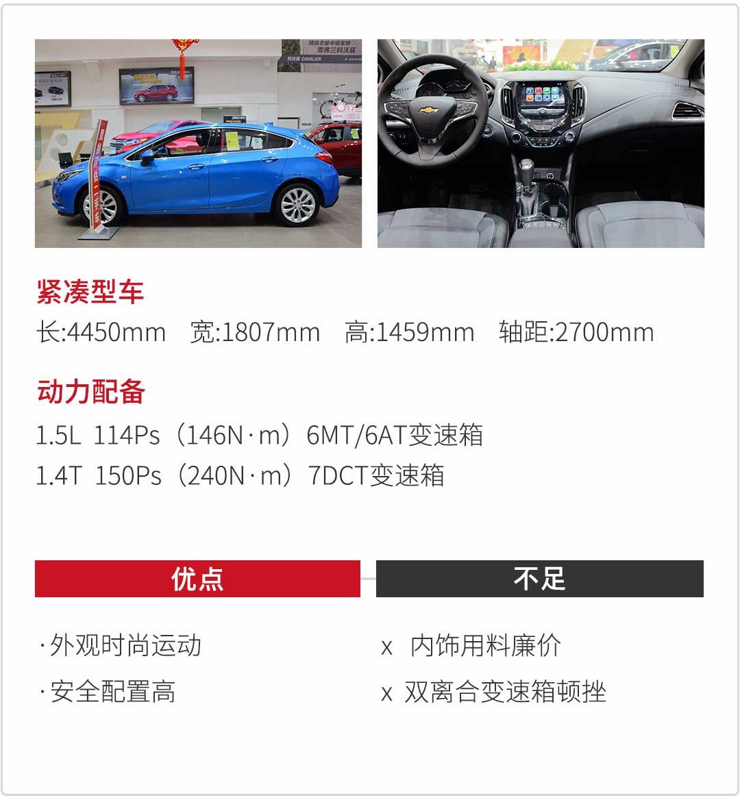 科鲁兹是一款经历过潮起潮落的车型,之前由于外观设计受到众人的争论,以致一直销量不好。新款2018科鲁兹卷土重来,车身外观时尚年轻,造型锐利有力,发动机盖灵感取自老大哥科尔维特的设计,车尾与车身非常协调,没有突然三厢被切一刀的断挡感觉。忽如一夜春风来,路面跑的科鲁兹又逐渐多起来了。两厢版的科鲁兹有2种动力总成,1.5L自然吸气发动机能输出114Ps 最大扭矩146N·m,并且匹配6MT/6AT变速箱;另外一种1.4T涡轮增压发动机,能爆发150Ps 最大扭矩240N·m,并匹配7DCT双离合变速箱,与同级别车型相比,动力一般,足够日常使用。