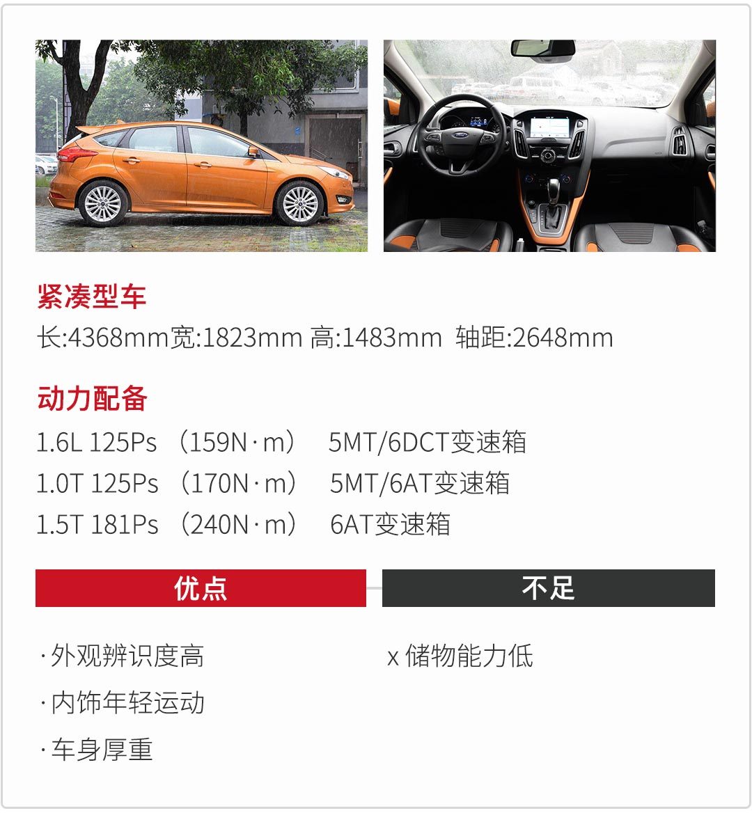 美系紧凑车型代表福克斯,全新的福克斯都换成了“马丁脸”,主打运动和年轻,两厢版比三厢版外观更加协调,相比三厢版多了一个尾翼,另外每一代福克斯都将掀背造型发挥得淋漓尽致。福克斯有3种动力总成,1.0T涡轮增压发动机,匹配5MT/6AT变速箱。1.6L自然吸气发动机匹配5MT/6DCT变速箱。1.5T涡轮增压发动机,匹配6AT变速箱。其中值得一提的1.5T涡轮增压发动机能爆发181Ps 最大扭矩240N·m,在同级别车型当中,对于一台小车来说,动力表现相当迅猛。