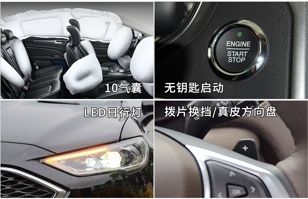 配置方面,乞丐版的蒙迪欧标配10个气囊、胎压监测、自动启停、无钥匙启动、带拨片的真皮方向盘、LED日行灯、卤素远近灯、雾灯、全车车窗一键升降,安全配置是比较给力的,这一点比帕萨特好,但其余就没有帕萨特那么丰富了,譬如自动驻车、后雷达。