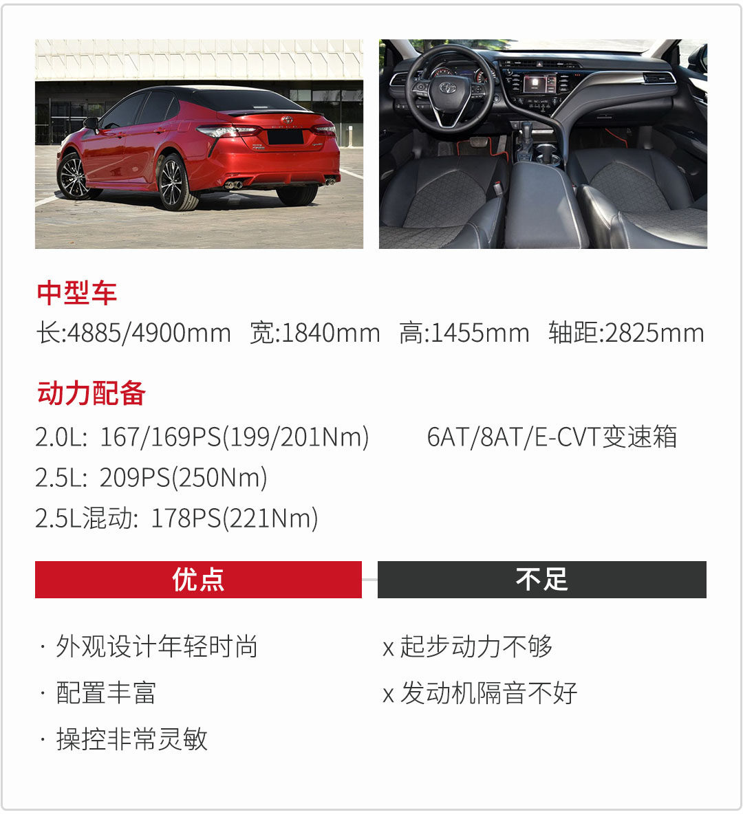 相比迈腾,凯美瑞更加年轻、富有动感,但在动力方面处于劣势,而坚持采用自吸发动机的凯美瑞在养护费用、可靠程度上则更有优势!