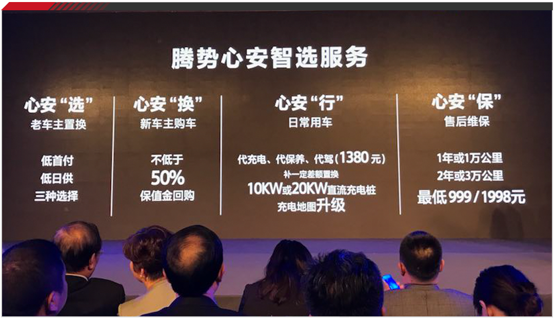 对于消费者购车前后的一些担心,腾势500给了消费者一个比较安心的回复;推出了“腾势心安智选服务”。该服务包括心安选(低首付、低日供、可购买/置换/归还)、心安换(老车主开票价*50%或50%以上=腾势500首付或购车款)、心安行(10次代充电、3次代保养、5次代驾)、心安保(1年或1万公里延保=999元,2年或3万公里延保=1998元)四大服务板块。这一系列的购车服务的确令消费者在购车时多了一份安心。